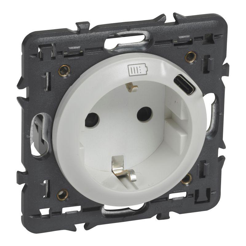 068119 | Розетка 2-м СП 2мод. Celiane 16А IP40 250В 2P+E комбинир. со встроен. зарядн. устройством USB C 1.5А 5В и суппортом с лиц. панелью бел. Leg