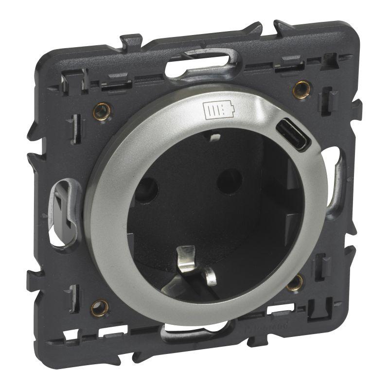 068419 | Розетка 2-м СП 2мод. Celiane 16А IP40 250В 2P+E комбинир. со встроен. зарядн. устройством USB C 1.5А 5В и суппортом с лиц. панелью титан Leg