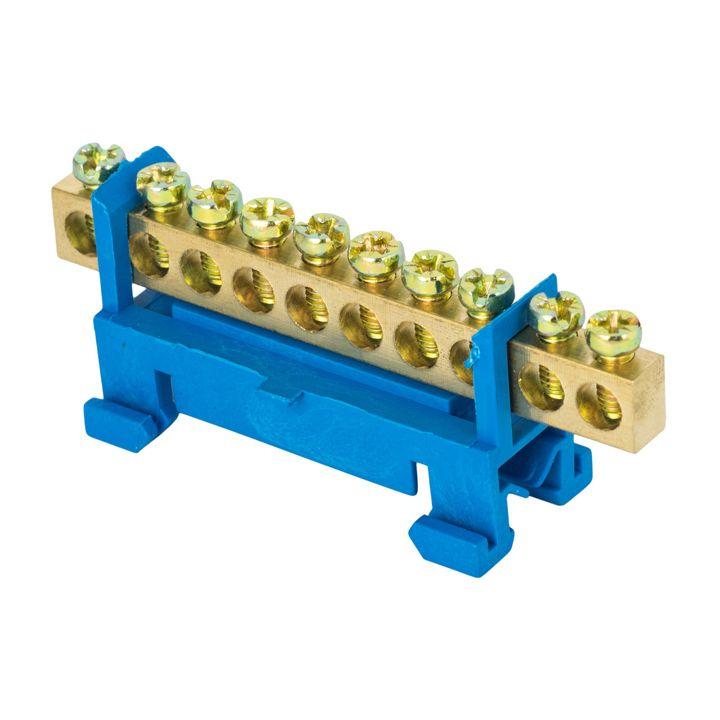 Шина нулевая N 6х9 10 отверстий синий изолятор тип "Стойка" на DIN-рейку латунь розн. стикер PROxima EKF sn0-63-10-sb-r
