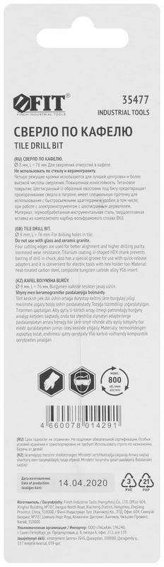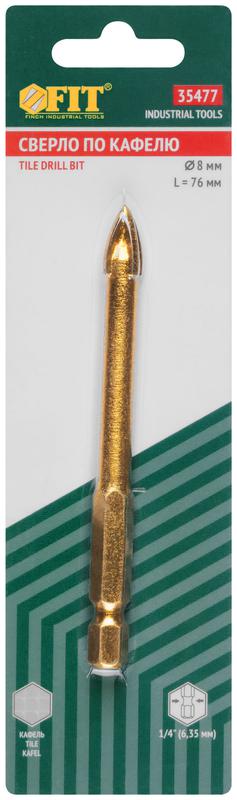 35477 | Сверло по кафелю 4 режущие кромки титан. покрытие U-хвостовик под биту 8х76мм FIT