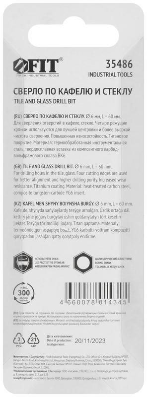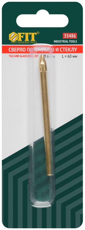 35486 | Сверло по кафелю и стеклу 4 режущие кромки титан. покрытие 6х60мм FIT