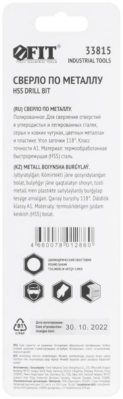 Сверло по металлу HSS 6.5мм полированное (блист.) FIT 33815