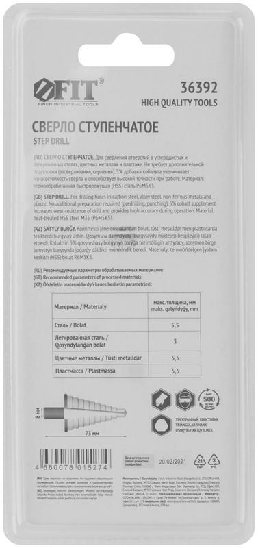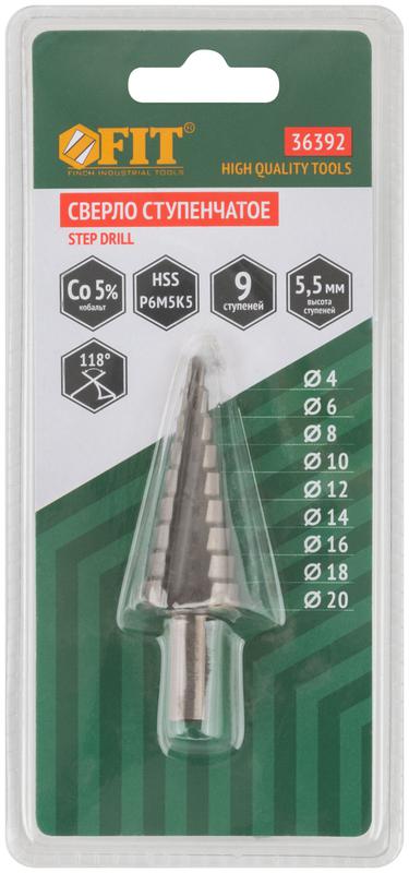 Сверло ступенчатое HSS Co5% (Р6М5К5) по металлу 9 ступеней 4-20мм FIT 36392