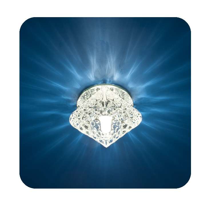 Основание круглое, из металла, блестящее, зеркальное. Диаметр 85 мм, диаметр монтажного отверстия 60 мм. Плафон стеклянный, сложной ромбовидной формы, декорирован под хрустальный.