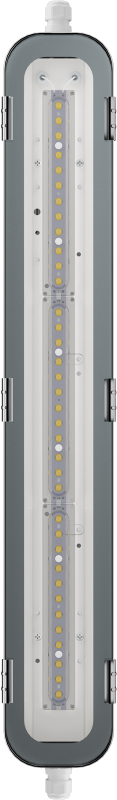 Штампованный корпус из нержавеющей стали марки AISI304 позволяет эксплуатировать светильник в тяжелых условиях. Силиконовый уплотнитель и клипсы жесткой фиксации надежно притягивают стекло к корпусу, что обеспечивает степень защиты IP66/IP67. Кабельный ввод с интегрированной клеммной колодкой позволяет подключать светильники без разбора корпуса и упрощает монтаж светильников в линию.