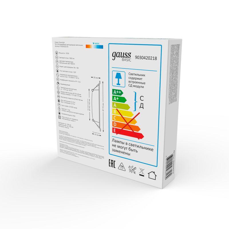 Светильник светодиодный Basic Downlight 18Вт 4000К IP20 1600лм 170-260В 170х26 круг бел. GAUSS 9030420218