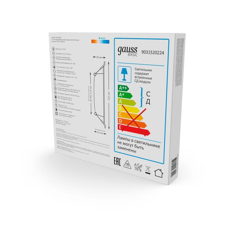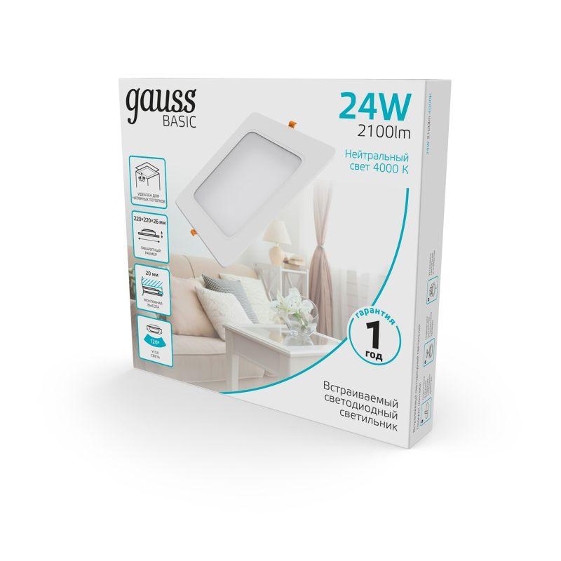 Светильник светодиодный Basic Downlight 24Вт 4000К IP20 2100лм 170-260В 220х26 квадрат бел. GAUSS 9031520224