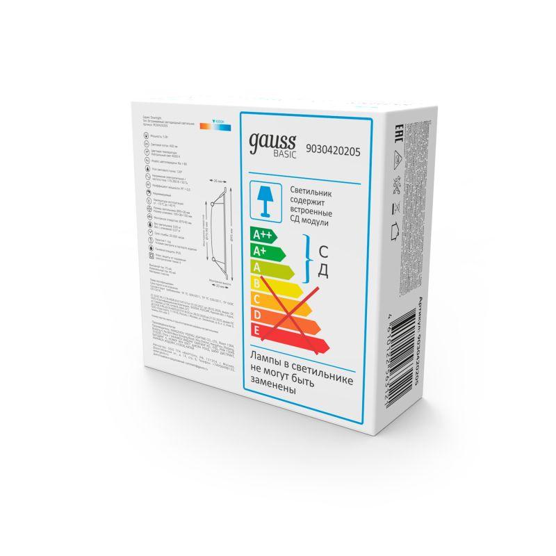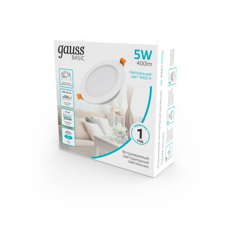 Светильник светодиодный Basic Downlight 5Вт 4000К IP20 400лм 170-260В 95х26 круг монтаж бел. GAUSS 9030420205