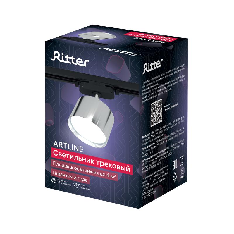 Светильник трековый ARTLINE поворотный 85х85х55мм. GX53 230В алюм. 4кв.м хром. Ritter 59859 0