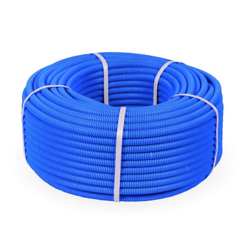 PR02.0055 | Труба гофрированная ПП тяжелая d16мм с протяжкой 750 Н безгалоген. (HF) син. (уп.100м) Промрукав