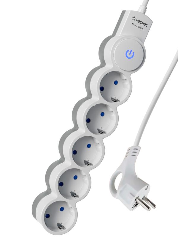 Удлинитель 5х3м ПВС 3х0.75 с защ. шторк. с заземл. IP20 с выкл. 220В 10А 2200Вт бел. КОСМОС YKsm3m-5g-Z-V10A-W