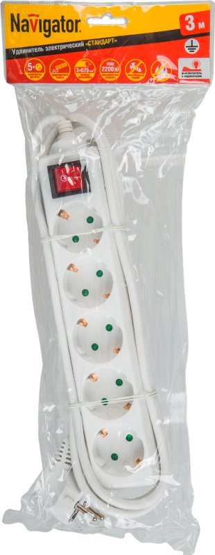 71557 | Удлинитель 5х3м с заземл. 10А IP20 71 557 NPE-S-05-300-ESC-3х0.75 3х0.75 с выкл. Navigator