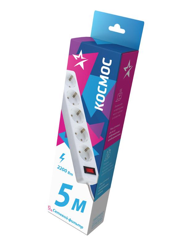 FKsm5m-5g(W) | Удлинитель с сетевым фильтром 5х5м с заземл. 10А IP20 2.2кВт ПВС 3х0.75 с выкл. с индикатором сети бел. КОСМОС