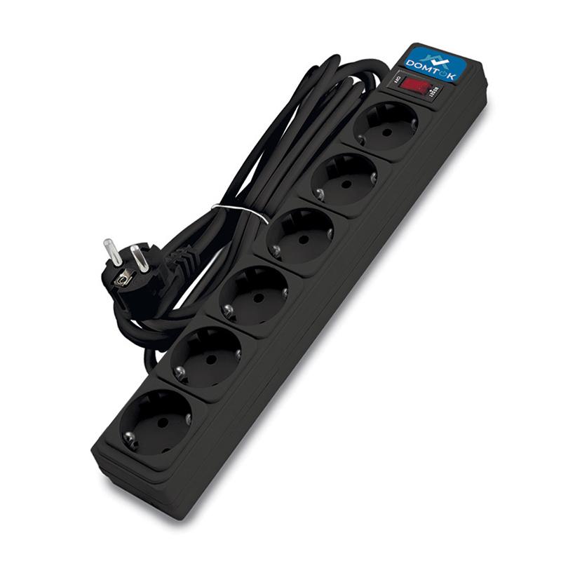 2523 | Удлинитель с сетевым фильтром 6х5м с заземл 10А IP20 2.2кВт ПВС 3х1 с выкл. черн. DOMTOK