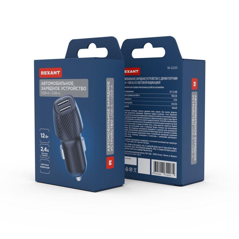 18-2220 | Устройство зарядное автомобильное с двумя портами USB-А + USB-A 12Вт со световой индикацией черн. Rexant