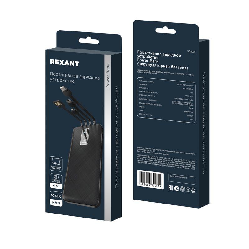 Устройство зарядное портативное Power Bank (аккумуляторная батарея) 10000мА.ч черн. Rexant 30-2038