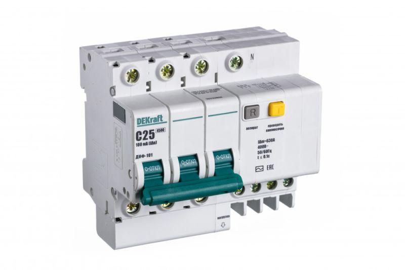 15222DEK | Выключатель автоматический дифференциального тока 4п (3P+N) C 25А 100мА тип AC ДИФ-101 со встроен. защитой от сверхтоков DEKraft