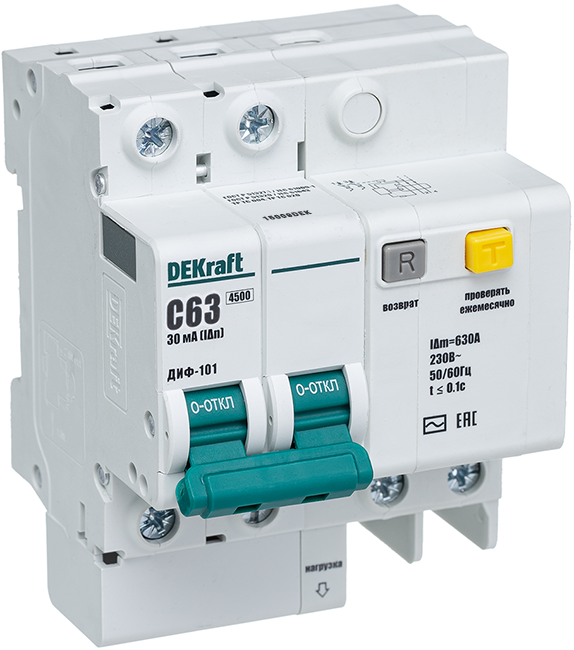 • Выключатель автоматический дифференциального тока 2п 4мод. C 63А 30мА тип AC 4.5кА АД-2 PROxima EKF DA2-63-30-pro