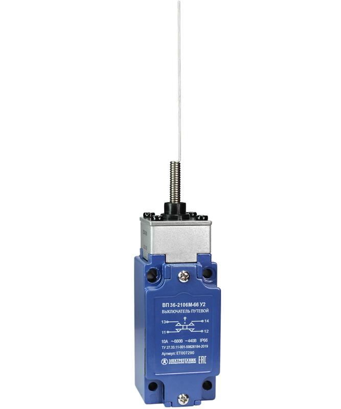 ET007290 | Выключатель путевой ВП 36-2106М-66 У2 рычаг пружинный "кошачий ус" 1з+1р безинерционный 30х60мм без сальника 3А IP66 Электротехник