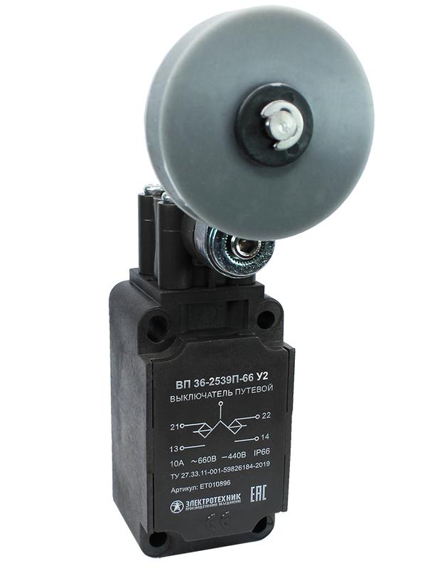 ET010896 | Выключатель путевой ВП 36-2539П-66 У2 рычаг с резиновым роликом диам. 50мм 1з+1р инерционный 30х60мм без сальника 3А IP66 Электротехник