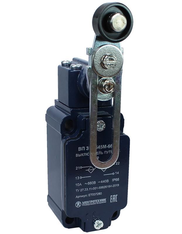 ET007280 | Выключатель путевой ВП 36-2545М-66 У2 рычаг с пластик. роликом регулир. по длине 1з+1р инерционный 30х60мм без сальника 3А IP66 Электротехник