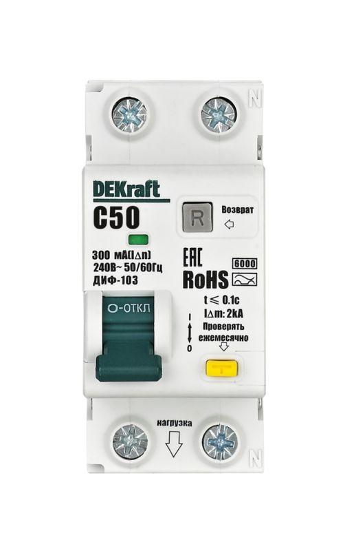 Выключатель автоматический дифференциального тока (АВДТ) 1P+N 50А 300мА A х-ка C ДИФ-103 6кА DEKraft 16370DEK