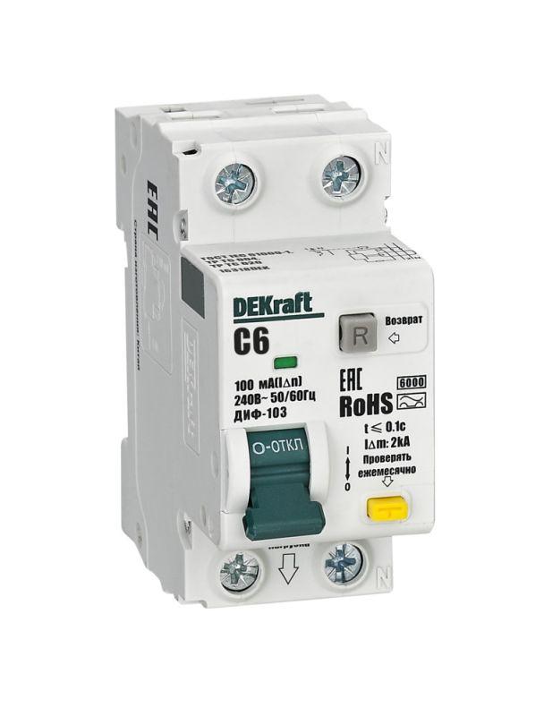 16318DEK | Выключатель автоматический дифференциального тока (АВДТ) 1P+N 6А 100мА AC х-ка C ДИФ-103 6кА DEKraft