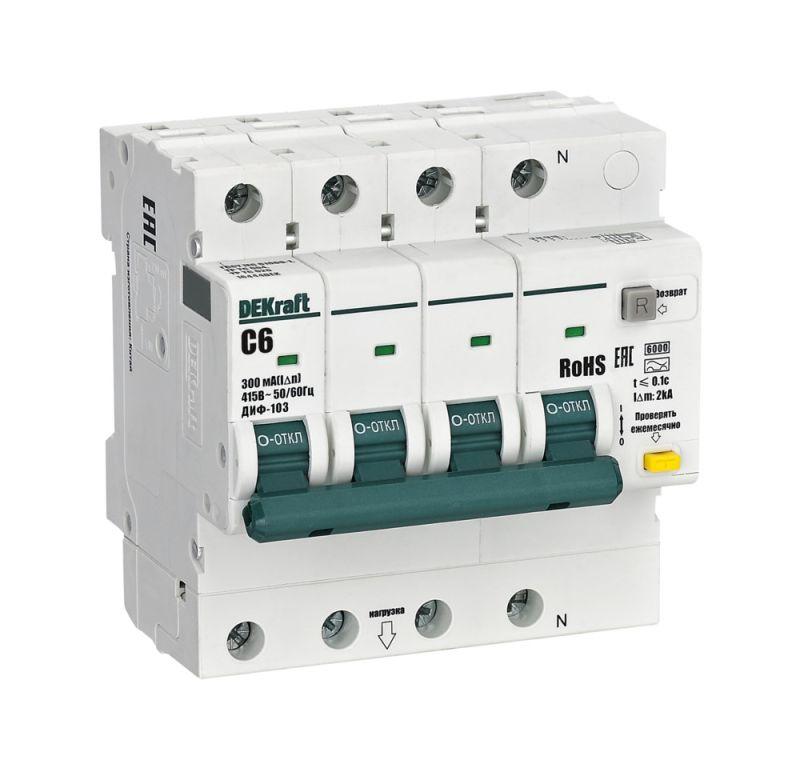 16444DEK | Выключатель автоматический дифференциального тока (АВДТ) 3P+N 6А 300мА A х-ка C ДИФ-103 6кА DEKraft