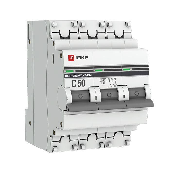 mcb4763m-6-3-50C-pro | Выключатель автоматический модульный 3п C 50А 6кА ВА 47-63M электромагнит. расцеп. PROxima EKF