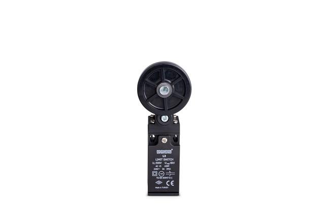 Выключатель концевой быстрого переключения угловой 2-х направленный с пластмас. консолью и резиновым роликом Ф50мм (1НО+1НЗ) EMAS L3K13MEL121