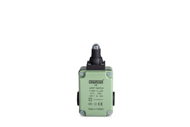 Выключатель концевой медленного переключения линейный 3-х направленный с пластмас. консолью и стальным плунжером и роликок Ф13мм (1НО+1НЗ) EMAS L1K23MUM331