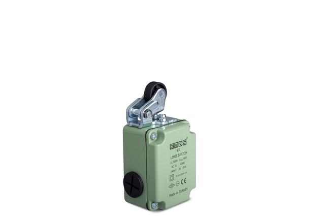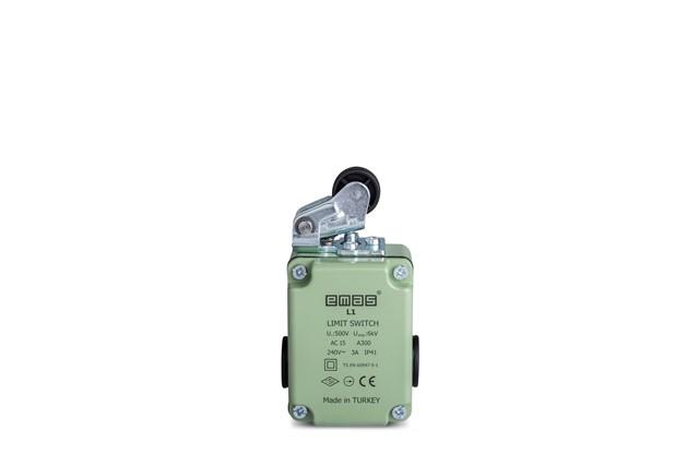 Выключатель концевой медленного переключения угловой 1-но направленный со стальной консолью и пластмас. роликом Ф22мм (1НО+1НЗ) EMAS L1K23MIP111