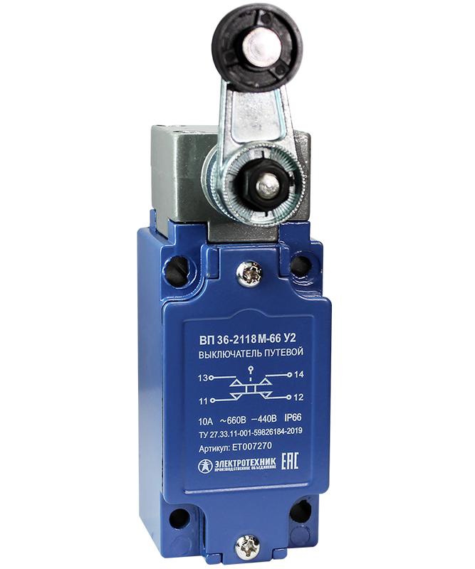 ET007270 | Выключатель путевой ВП 36-2118М-66 У2 1НО+1НЗ 3А IP66 рычаг с пластиковым роликом безинерционный 30х60мм без сальника Электротехник