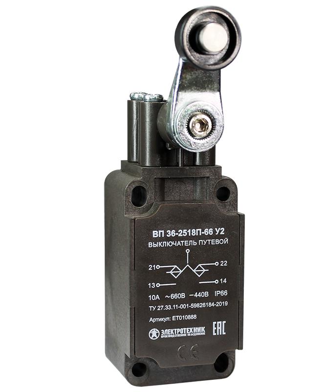 ET010888 | Выключатель путевой ВП 36-2518П-66 У2 1НО+1НЗ 3А IP66 рычаг с пластиковым роликом инерционный 30х60мм без сальника Электротехник