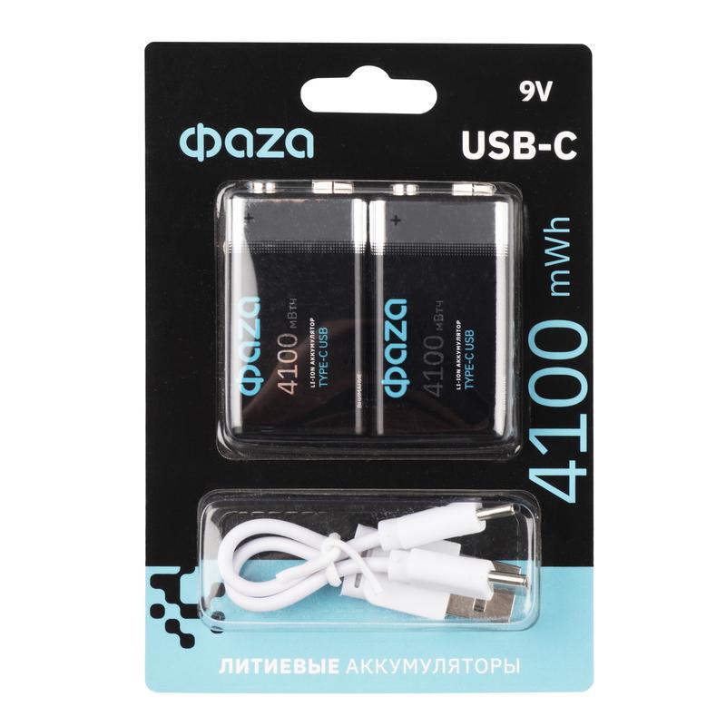 Аккумулятор литиевый "крона" 9В Li-Ion 4100мВт.ч 455мА.ч зарядка от Type-C шнур в комплекте BL-2 (уп.2шт) ФАZА 5061699