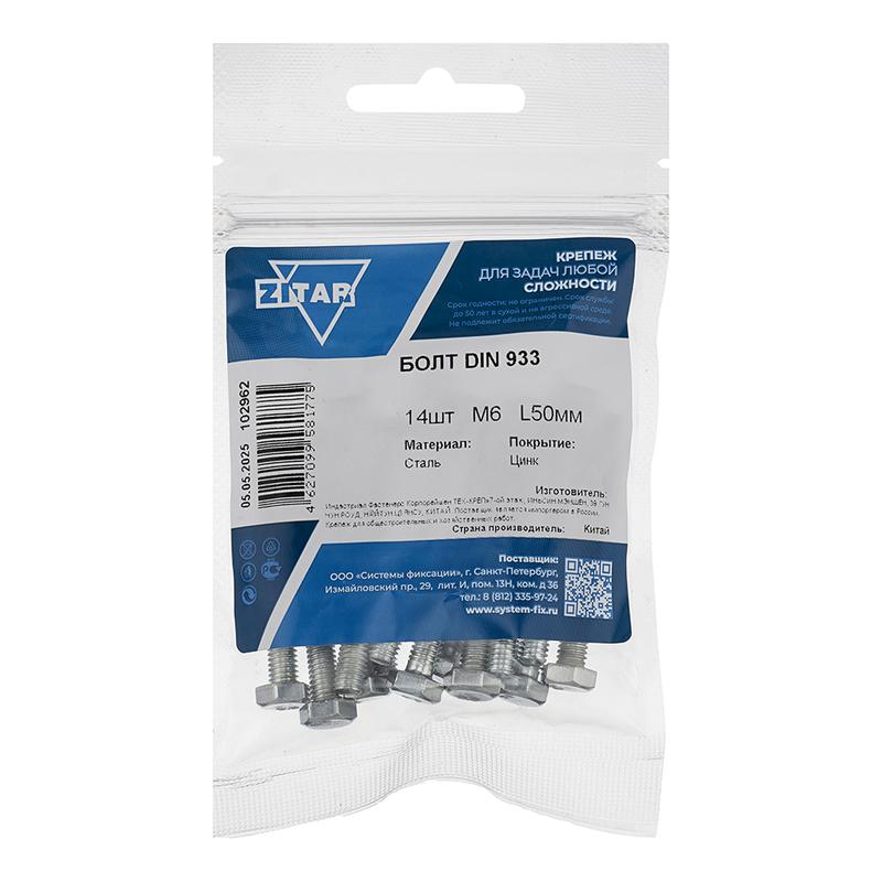 Болт с шестигранной головкой М6х50 DIN 933 оцинк. (уп.14шт) Tech-Krep/Zitar 102962