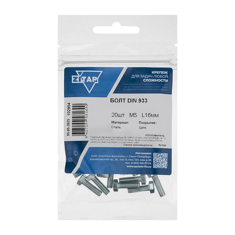 Болт с шестигранной головкой М5х16 DIN 933 оцинк. (уп.20шт) Tech-Krep/Zitar 102954