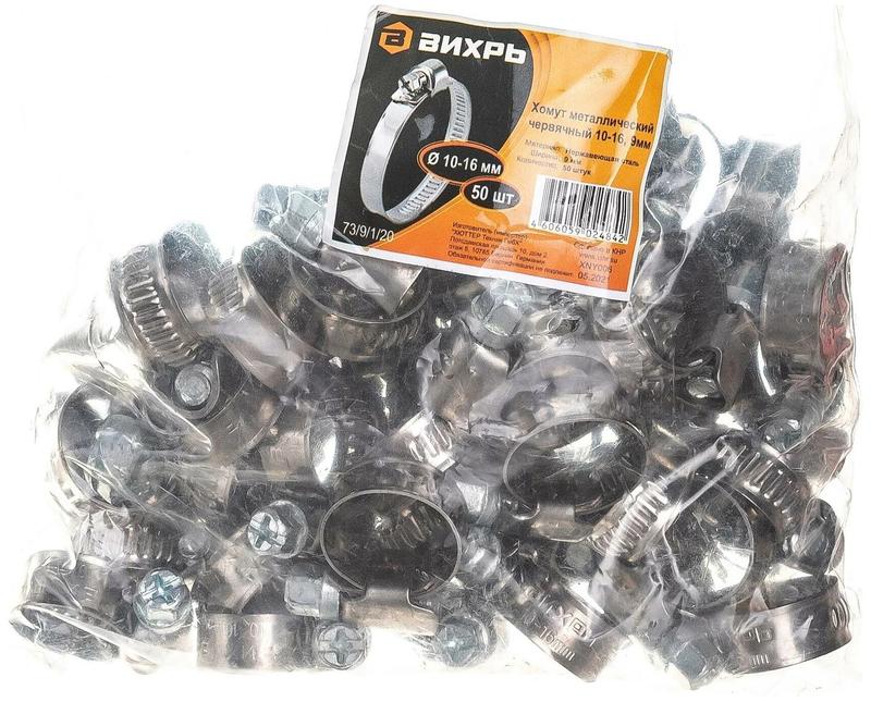 Хомут металлический червячный 10-16 9мм (уп.50шт) Вихрь 73/9/1/20