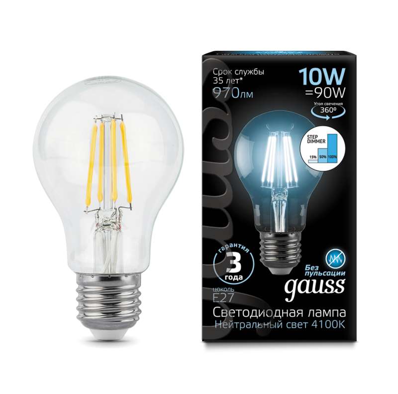 Лампа светодиодная Black Filament A60 10Вт 4100К E27 step dimmable Gauss 102802210-S