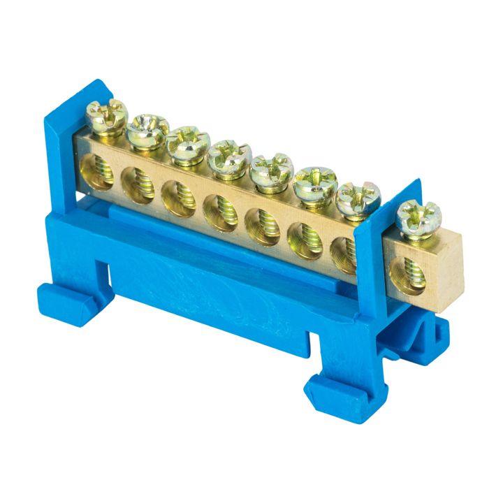 Шина нулевая N 6х9 8 отверстий синий изолятор тип "Стойка" на DIN-рейку латунь розн. стикер PROxima EKF sn0-63-8-sb-r