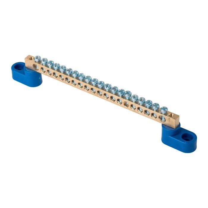 Шина нулевая N 6х9 20 отвер. латунь 2 син. угловых изолятора розн. стикер EKF sn0-2-63-20-r