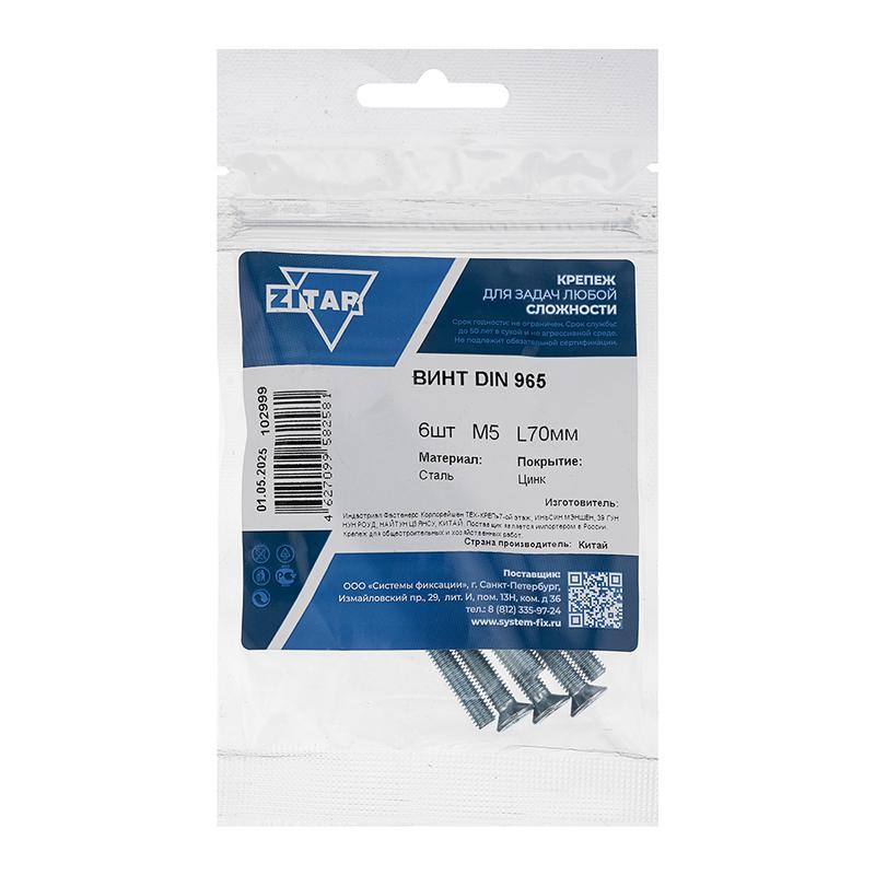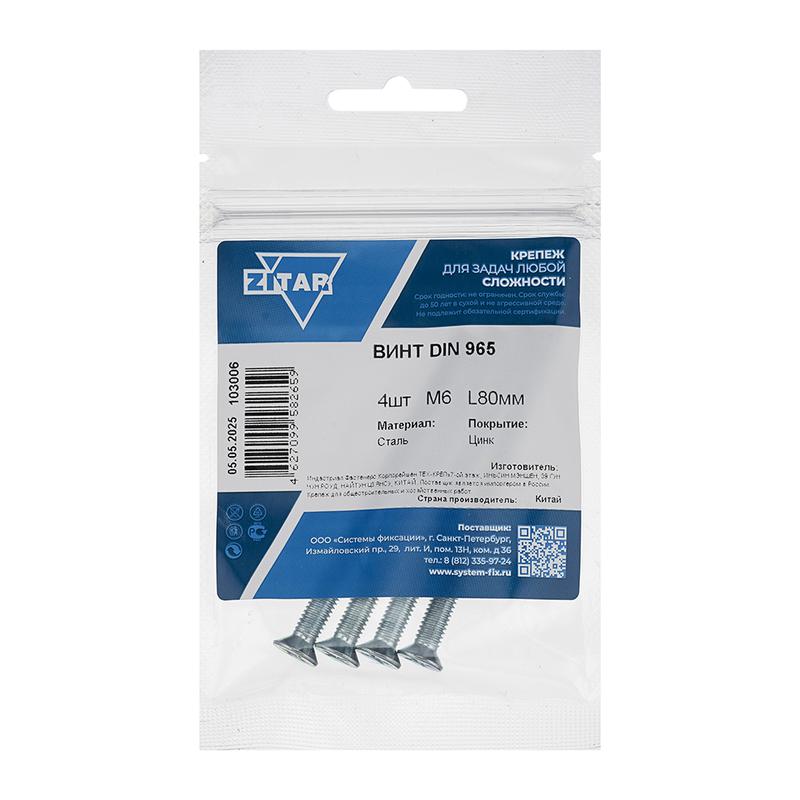 Винт с потайной головкой М6х80 DIN 965 оцинк. (уп.4шт) Tech-Krep/Zitar 103006