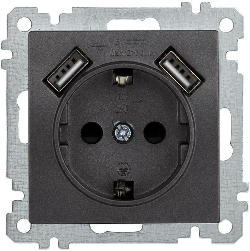 Механизм розетки 1-м СП Bolero Рюш10-1-Б 16А IP20 с заземл. защ. шторки с 2-мя заряд. устройствами USB 2.1А антрацит IEK ERB14-K95-16-U2