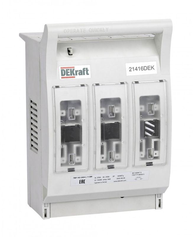 21416DEK | Выключатель-разъединитель-предохранитель ПВР горизонт. 250А 3ф отключ. 1НО+1НЗ навесной монтаж на шину ПВР-102 DEKraft