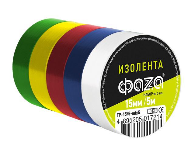 Изолента ПВХ 15ммх5м 5 цветов (уп.5шт) ФАZА 5017214