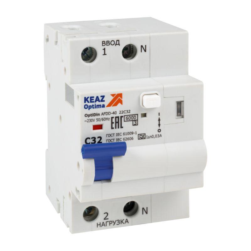 Устройство защиты от дугового пробоя с АВДТ и защ. от пов. напряж. OptiDin AFDD-40-22C32-A-У3 (2P C32 30mA Uоткл 275В) КЭАЗ 339090