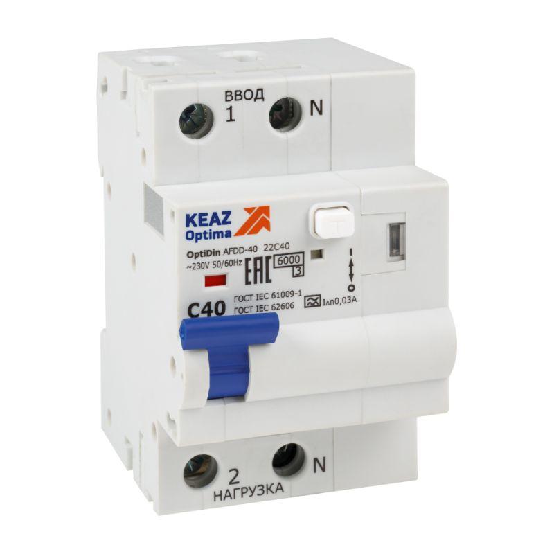 Устройство защиты от дугового пробоя с АВДТ и защ. от пов. напряж. OptiDin AFDD-40-22C6-A-У3 (2P C6 30mA Uоткл 275В) КЭАЗ 339082
