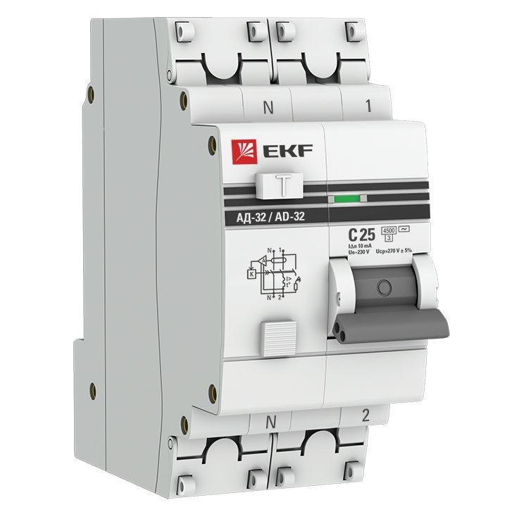 Выключатель автоматический дифференциального тока 2п (1P+N) B 25А 10мА тип AC 4.5кА АД-32 защита 270В электрон. PROxima EKF DA32-25-B-10-pro