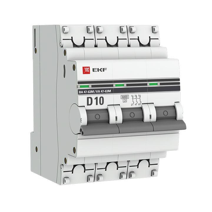 mcb4763m-6-3-10D-pro | Выключатель автоматический модульный 3п D 10А 6кА ВА 47-63M с одним магнит. расцеп. EKF